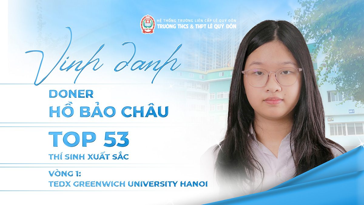 (LQĐ) – Học tập tại ngôi trường mà tiếng Anh được chú trọng và khuyến khích sử dụng thường xuyên, em Hồ Bảo Châu – học sinh lớp 10D0 đã xuất sắc ghi tên vào TOP 53 TEDx Greenwich University Hanoi – cuộc thi yêu cầu thí sinh trình bày hoàn toàn bằng tiếng Anh ngay từ vòng đầu tiên. Thành tích ấy không chỉ là niềm tự hào của cá nhân Châu mà còn là minh chứng sinh động cho định hướng phát triển năng lực ngoại ngữ của Trường THCS & THPT Lê Quý Đôn.