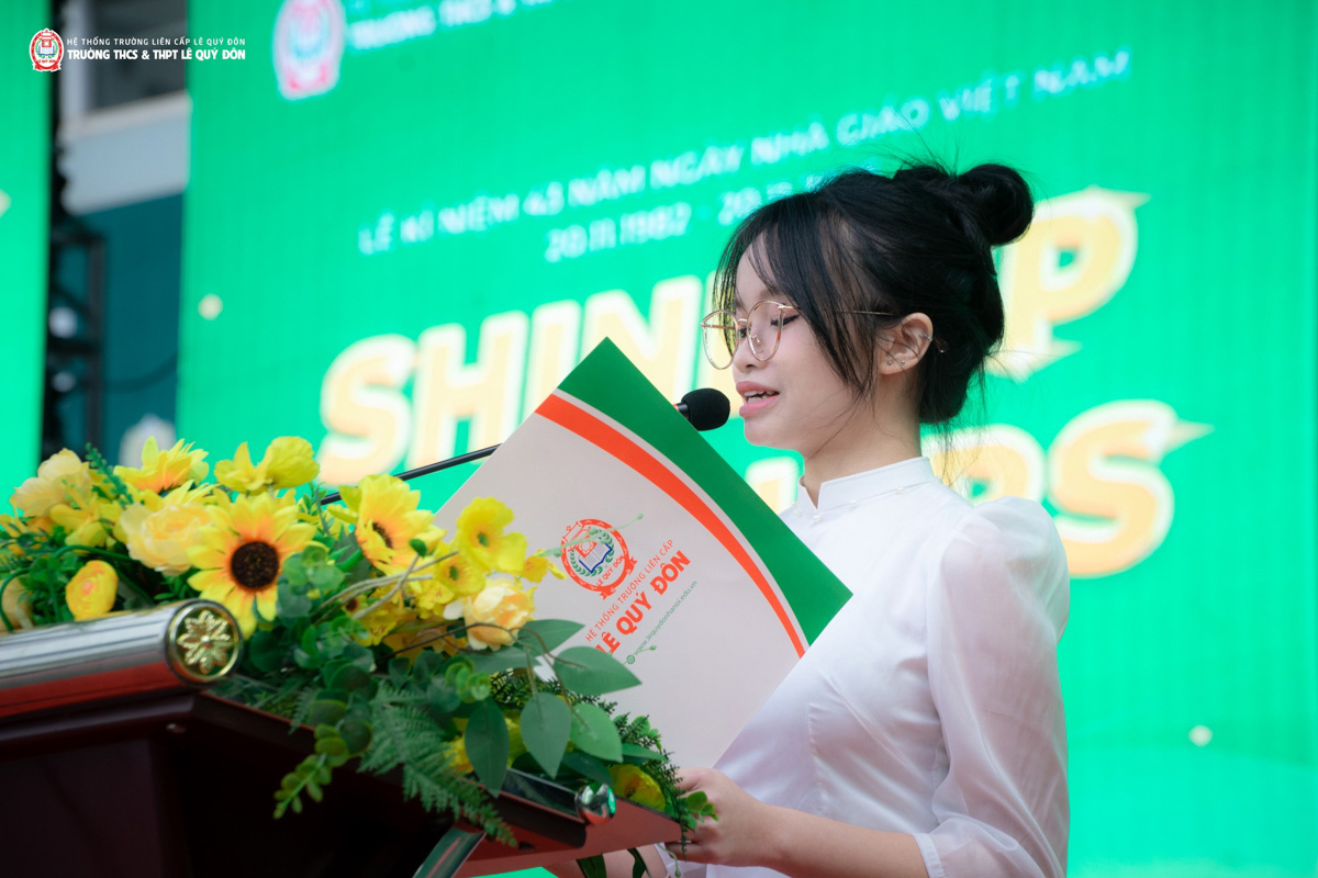 Thay mặt học sinh toàn trường, em Nguyễn Ngọc Hà Linh (12D4) bày tỏ lòng biết ơn sâu sắc, cảm ơn Thầy, Cô đã thắp sáng trí tuệ. Cảm ơn Thầy, Cô đã gieo vào mỗi học sinh niềm tin và nghị lực, để Lê Quý Đôn là nơi chất chứa hạnh phúc, để mỗi học sinh đến trường với niềm hạnh phúc và sự bình an.