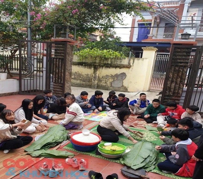 Và thế là, một chuyến trải nghiệm nhỏ được lên kế hoạch. Tôi tổ chức cho các con về Mê Linh – Hà Nội, học gói bánh chưng tại nhà, sống trọn vẹn trong không khí Tết đúng nghĩa. Ban đầu, nhiều con còn lúng túng: lá dong gấp mãi không vuông, gạo đổ vương vãi, lạt buộc thì chỗ chặt chỗ lỏng. Có bạn vừa làm vừa kêu mệt, có bạn cười phá lên vì chiếc bánh méo không giống… bánh chưng chút nào.